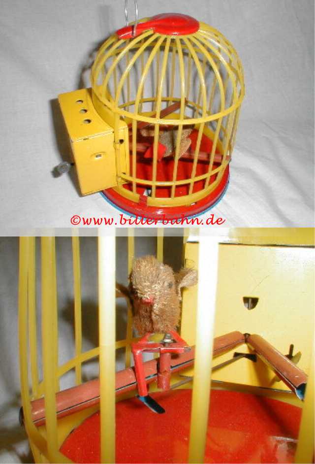 dreht sich dabei blitzschnell um. Käfig aus Metall und Plastik, bunt