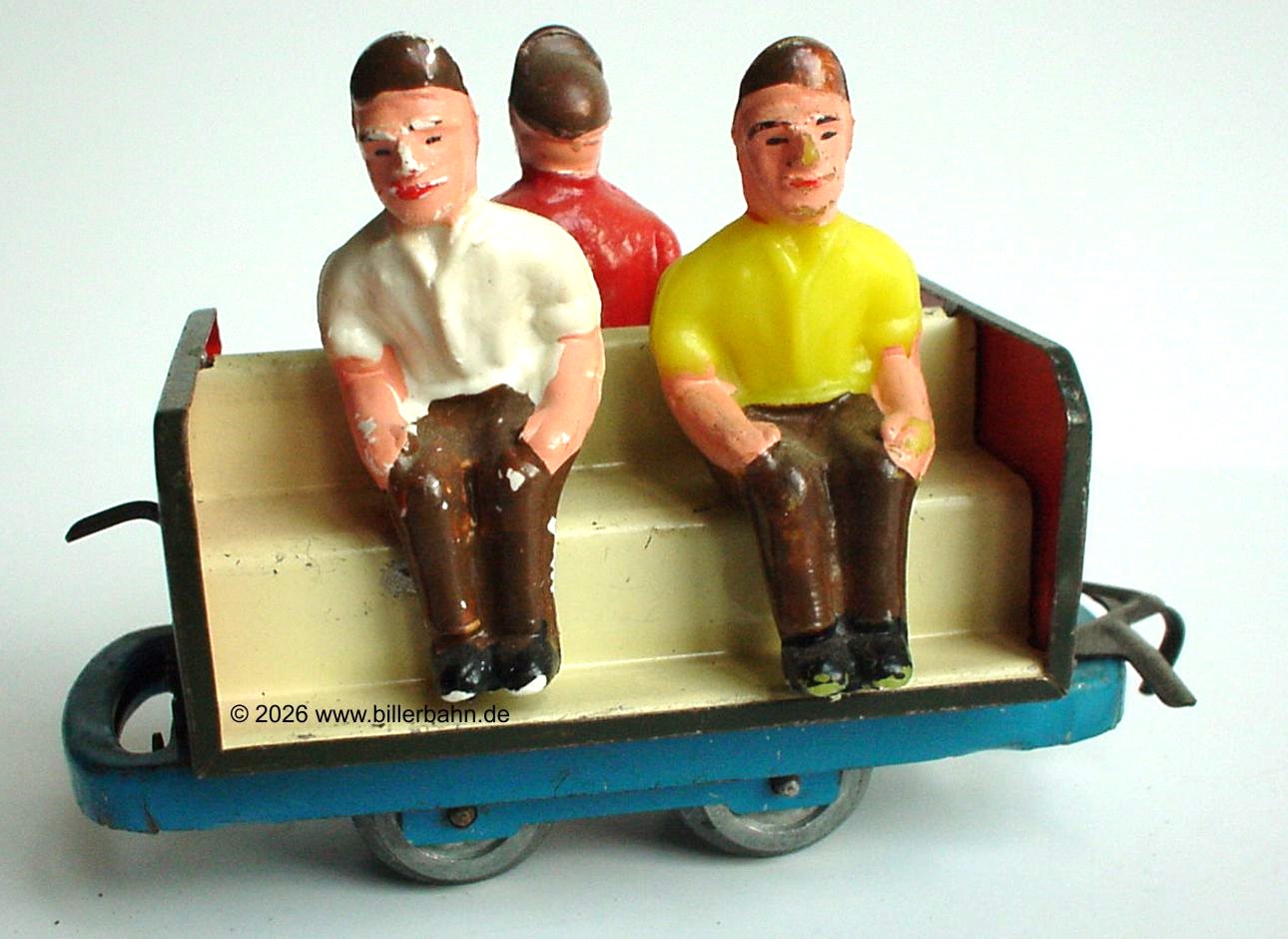 | Figuren der ersten Serie mit Hosenträgern auf orangefarbener Sitzbank. Der Wagen mit grünem Chassis. | Figuren der 2. Serie ohne Hosenträger auf orangefarbener Sitzbank. Der Wagen mit rotem Chassis. | ||