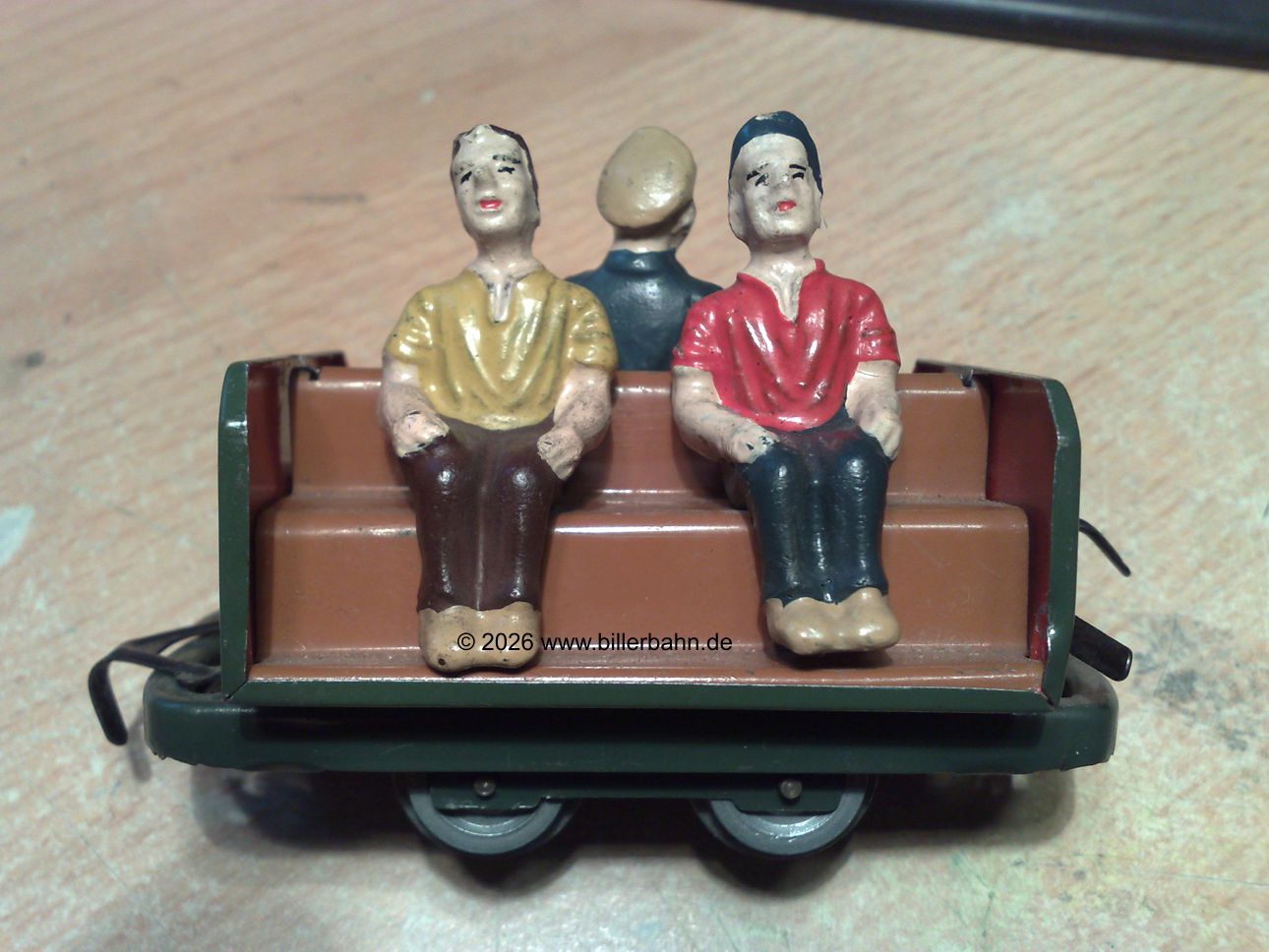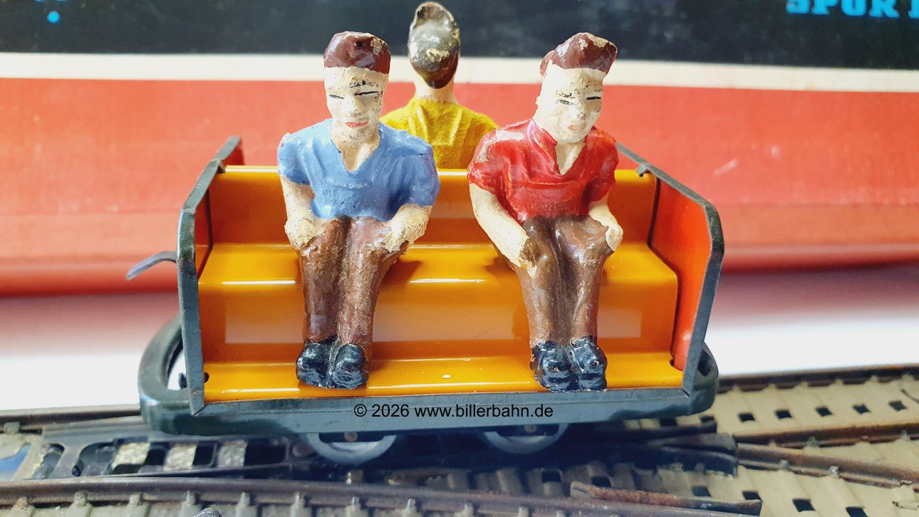 | orangefarbene Sitzbank mit Plastik-Figuren ohne Hosenträger. Der Wagen mit grünem Chassis. | 4 Farben der Sitzbänke auf grünem Chassis: 4 Beige, Orange, Dunkel- und Hellbraun |