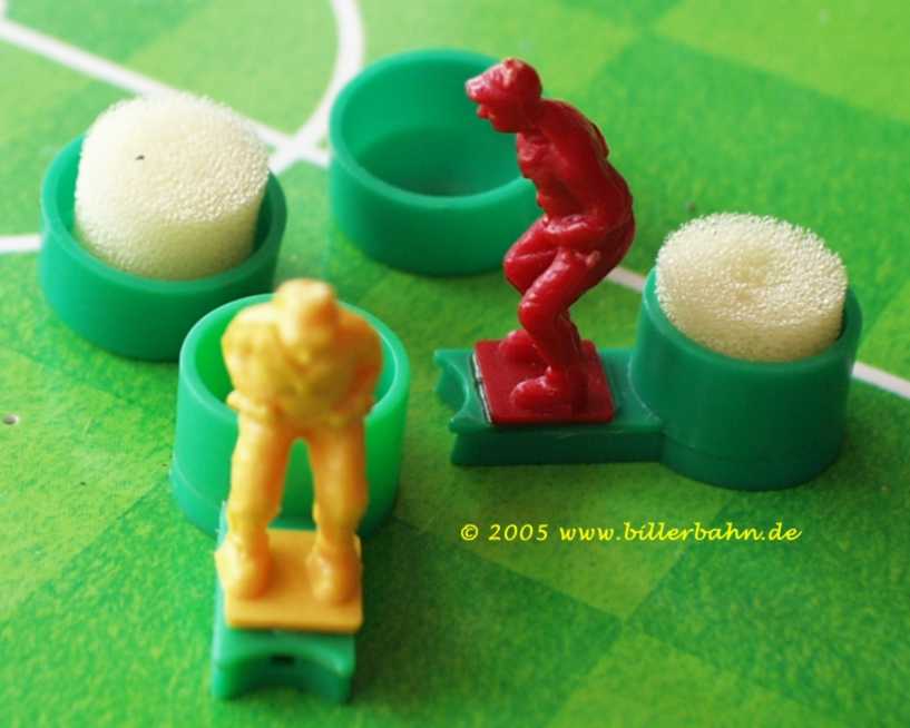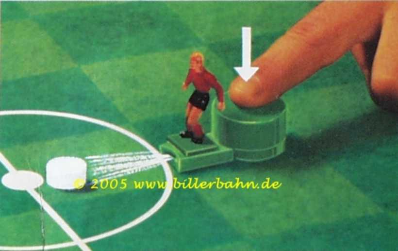 How it works: as shown on the pictures below, the kids had to push the button behind the player / goal keeper, thus the air inside that little chamber was compressed and left the player at the front bottom with a "blast" and pushed the "ball" forward. The "ball" was a 4 x 15 mm round foam material (missing here). The foam material inside the chamber was needed to reject the lid of the chamber.