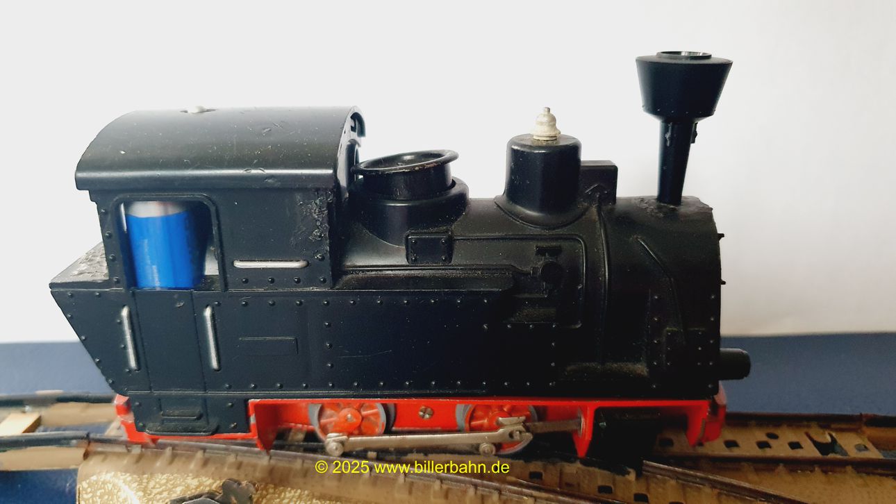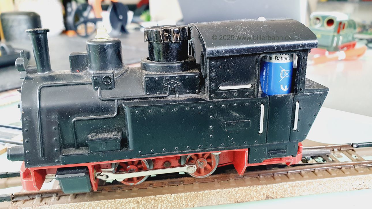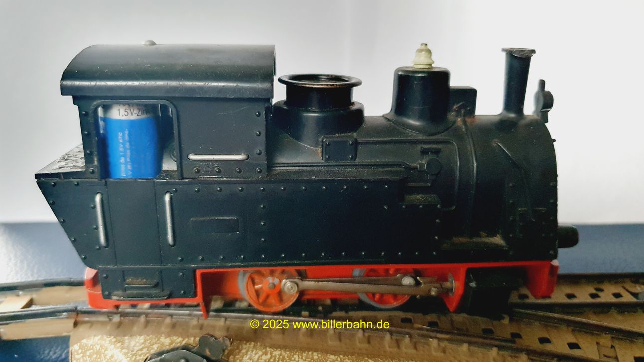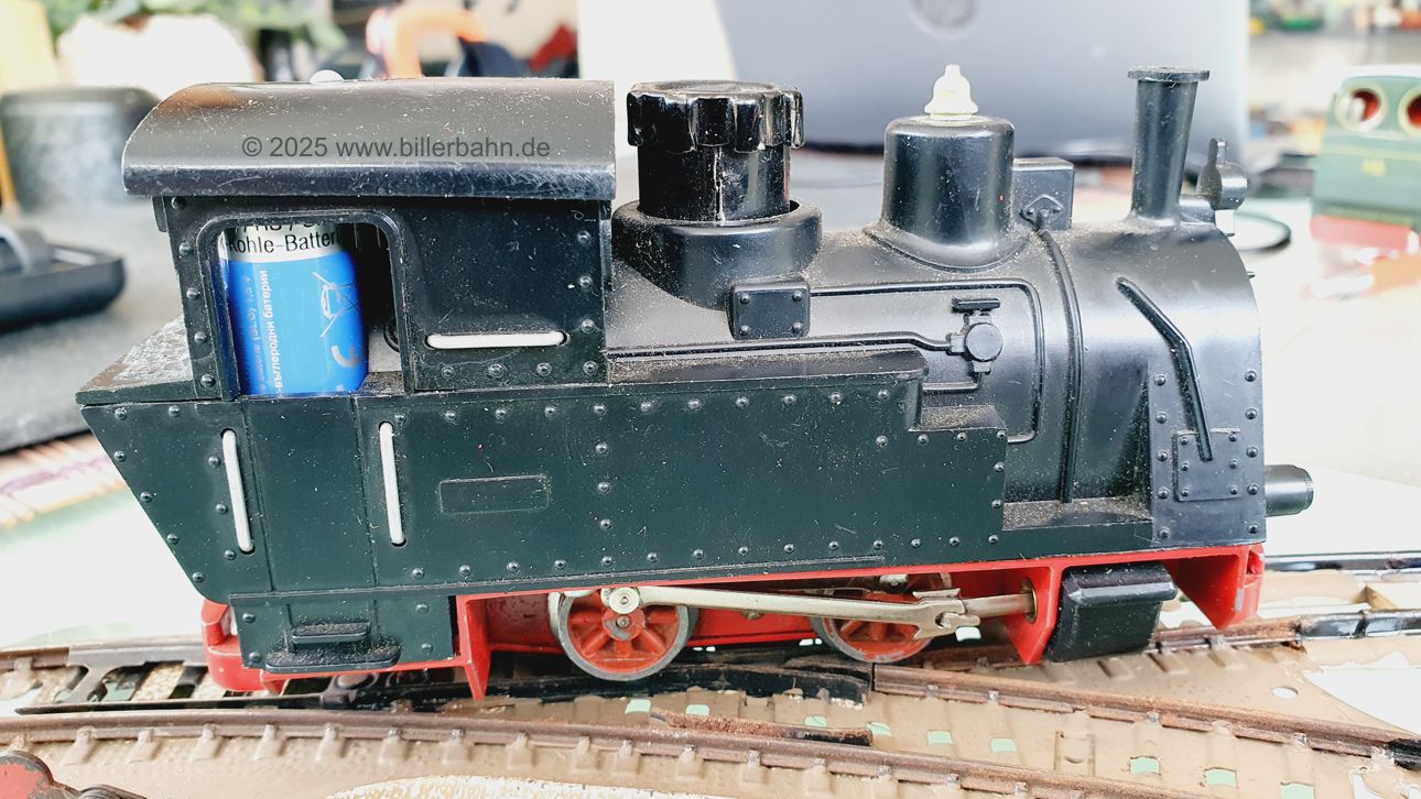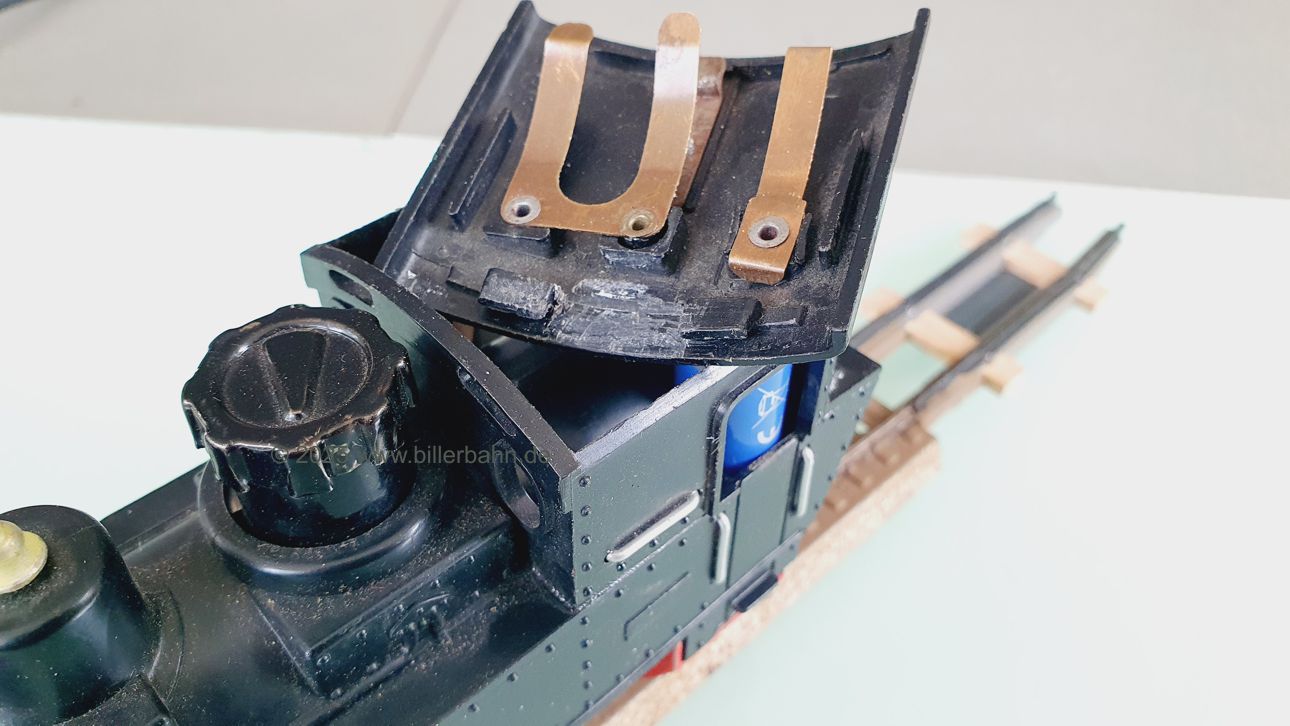 | #2 - gebrauchter Zustand, intgrierte Radabdeckungen. Diese "Sonderversion" mit Batterieantrieb hat einen Kobelschonstein - weil das Original abgebrochen war. Es fehlt die obere Frontlampe und beide Stege der vorderen Dachhalterung sind rausgebrochen - dennoch hält das Dach einwandfrei. Die Lok ist getestet und funktioniert gut. | |||