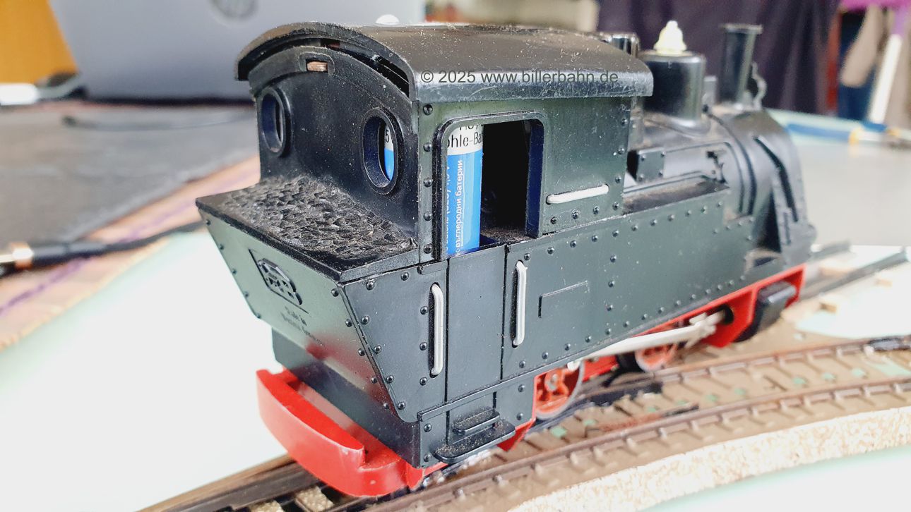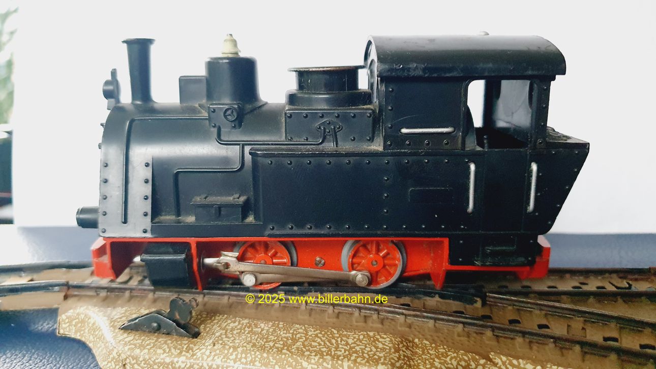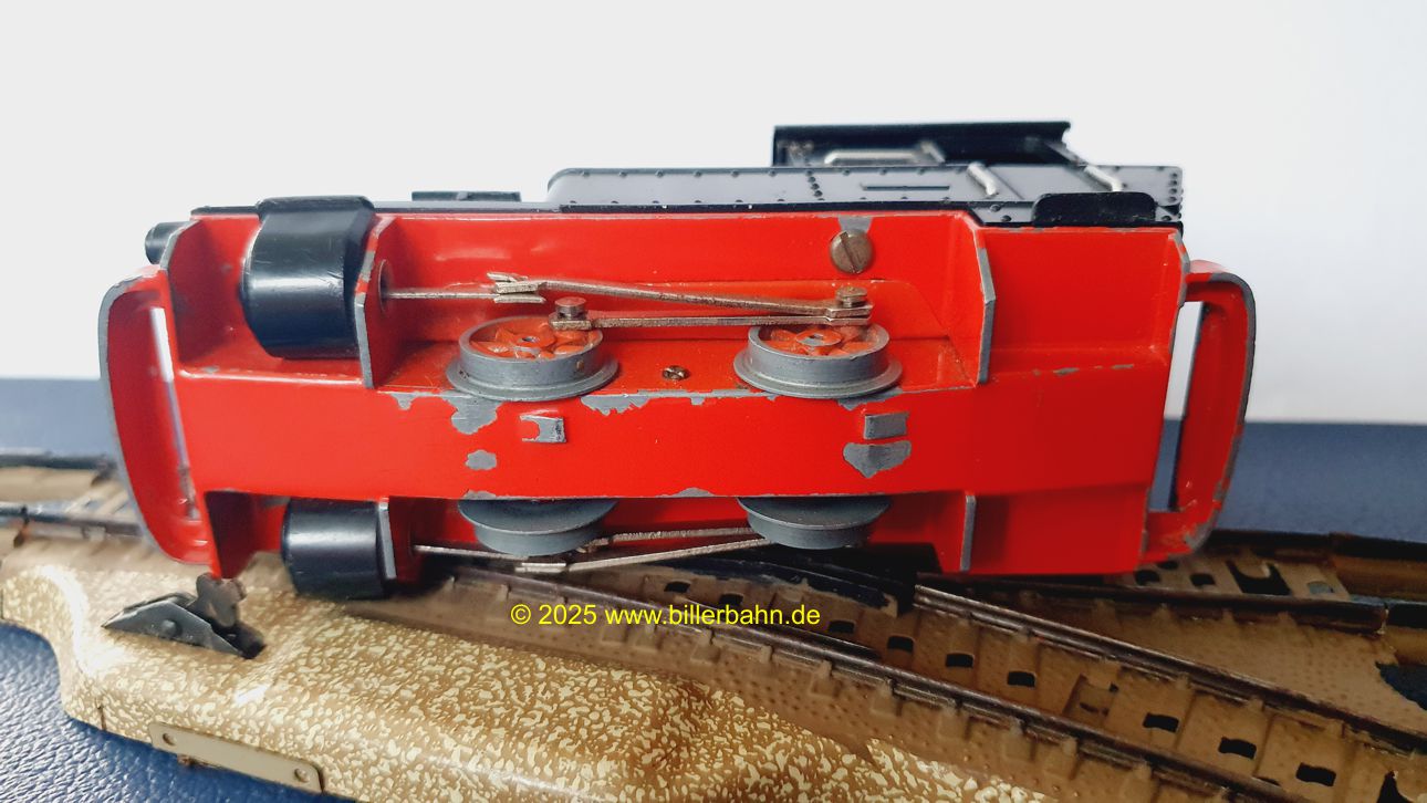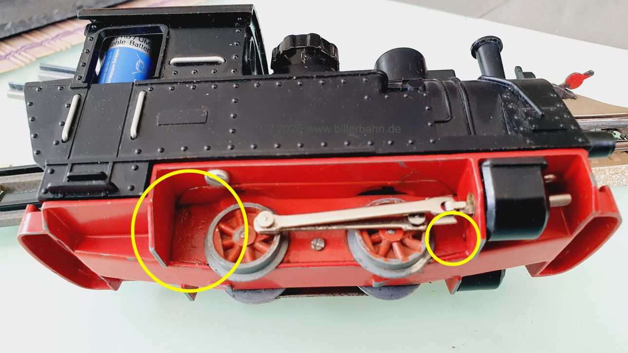 | #2 - gebrauchter Zustand, intgrierte Radabdeckungen. Diese "Sonderversion" mit Batterieantrieb hat einen Kobelschonstein - weil das Original abgebrochen war. Es fehlt die obere Frontlampe und beide Stege der vorderen Dachhalterung sind rausgebrochen - dennoch hält das Dach einwandfrei. Die Lok ist getestet und funktioniert gut. | |||