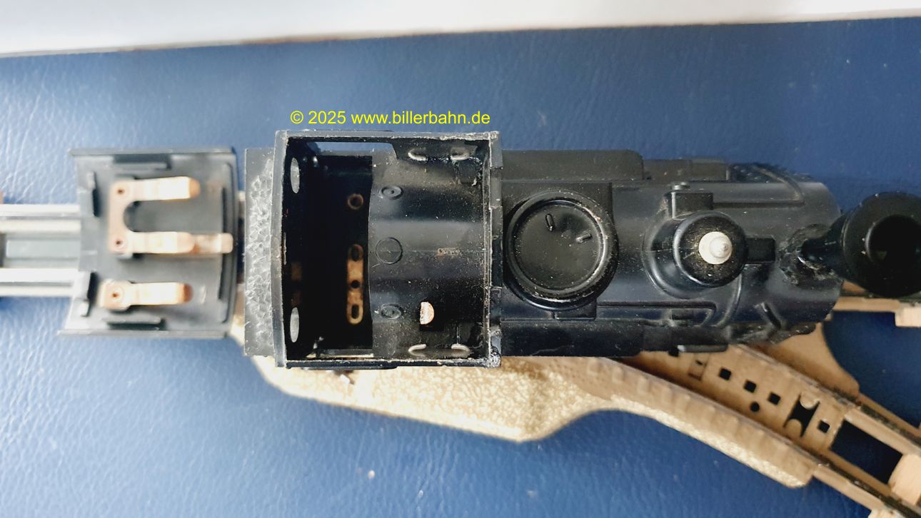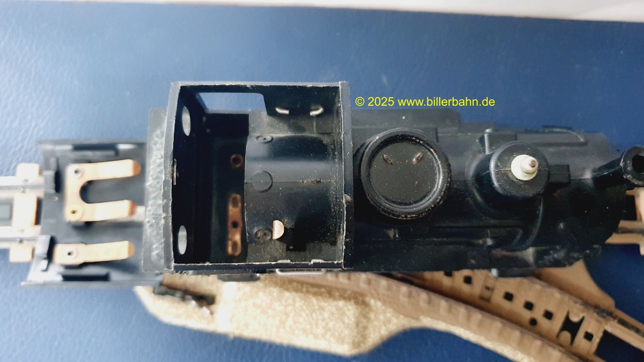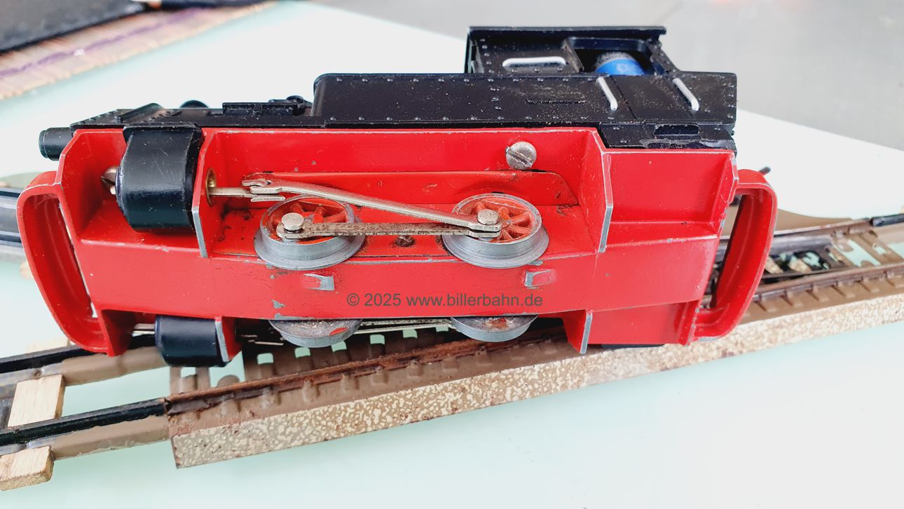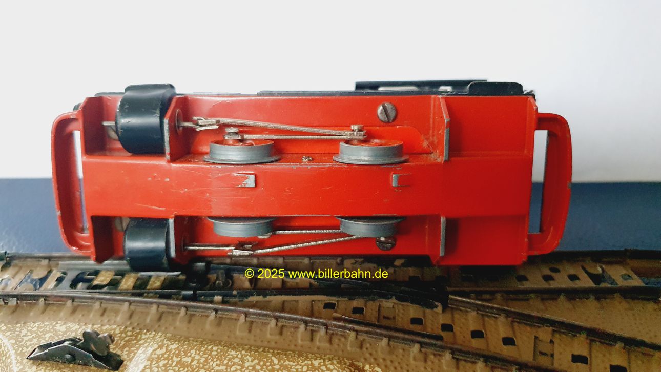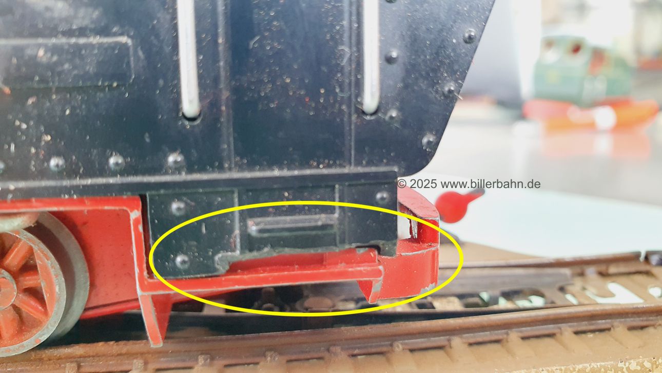 | #2 - gebrauchter Zustand, intgrierte Radabdeckungen. Diese "Sonderversion" mit Batterieantrieb hat einen Kobelschonstein - weil das Original abgebrochen war. Es fehlt die obere Frontlampe und beide Stege der vorderen Dachhalterung sind rausgebrochen - dennoch hält das Dach einwandfrei. Die Lok ist getestet und funktioniert gut. | |||