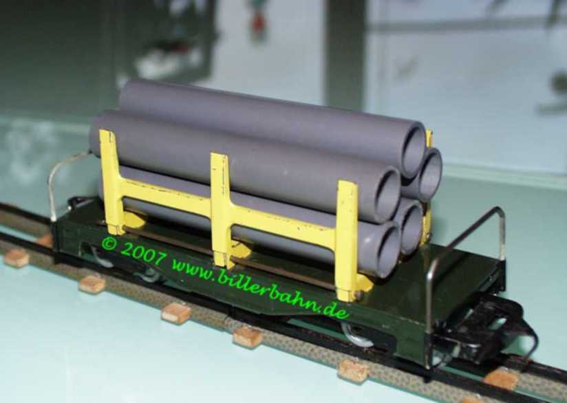 dunkelgrünes oder schwarzes Fahrwerk, gelbe Rungen, Plastik "Röhren"
