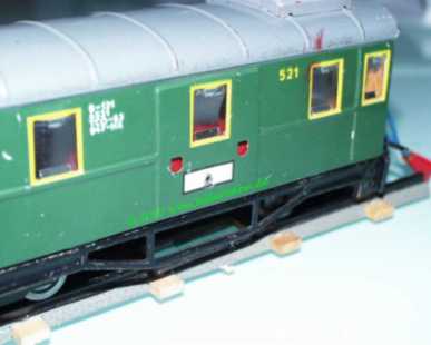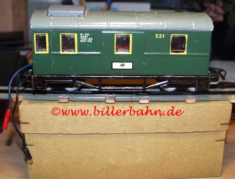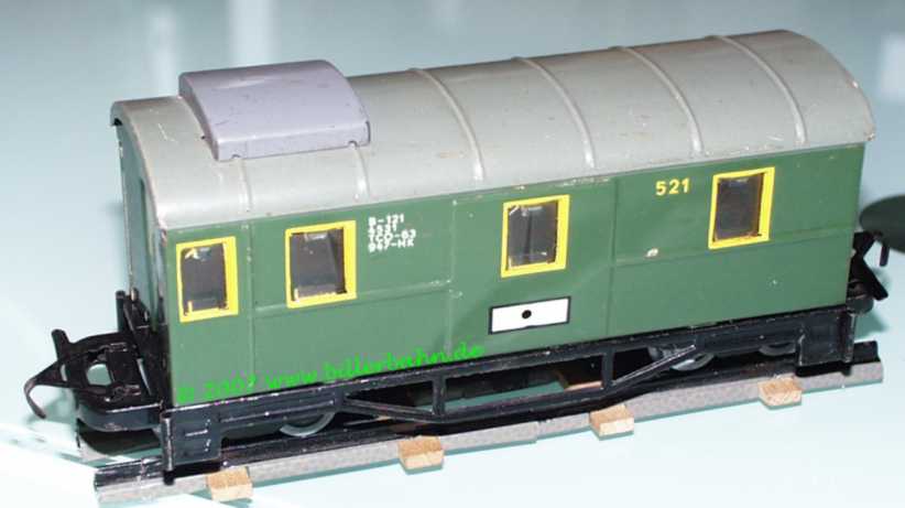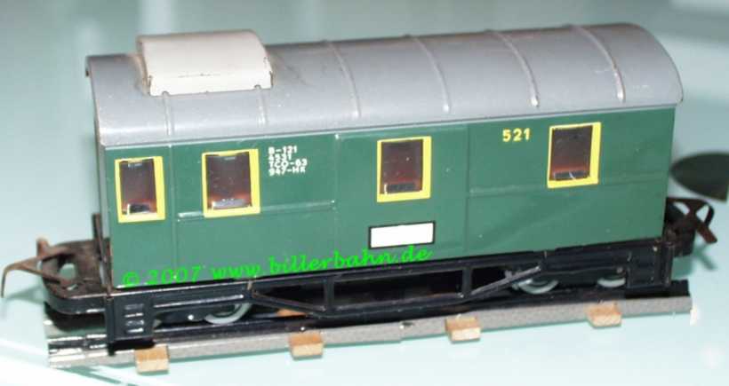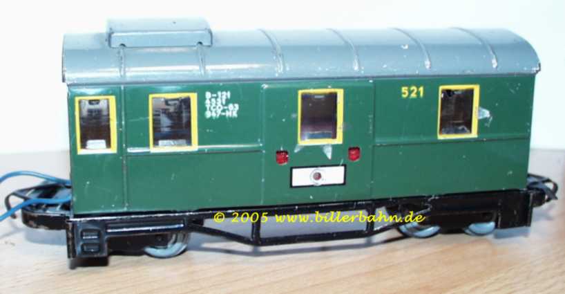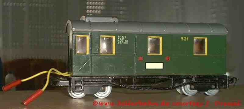 Packwagen, grün, alles Blech. Dach hell- oder dunkelgrau. Die Kabeldurchführung erfolgt durch 2 Aussparungen in den Stirnwänden. Der Batteriekasten ist bei dieser Version genietet - man sieht das Loch im Zuglaufschild. Auch hier gibt es Versionen mit ein- oder beidseitigen Löchern für die Kabeldurchführung |