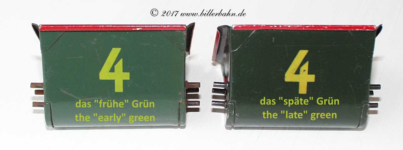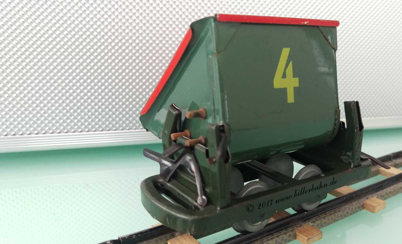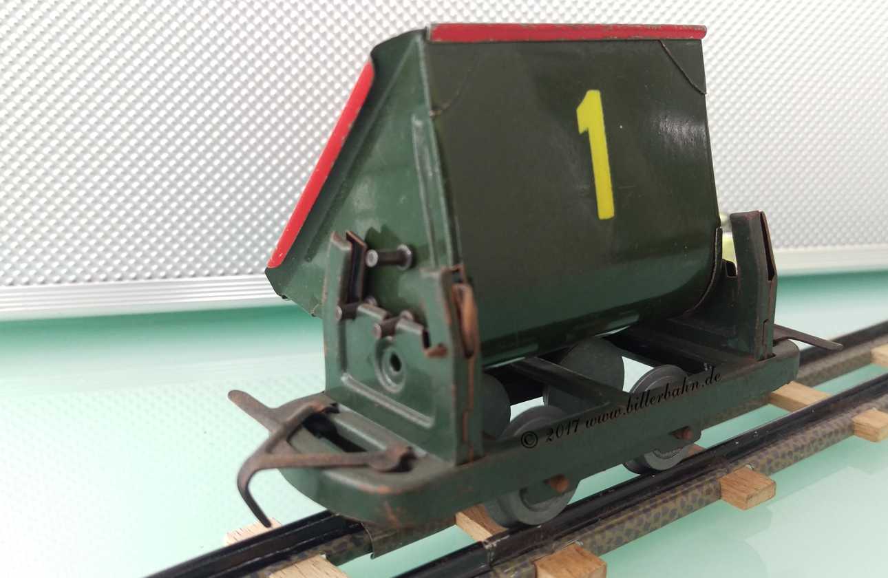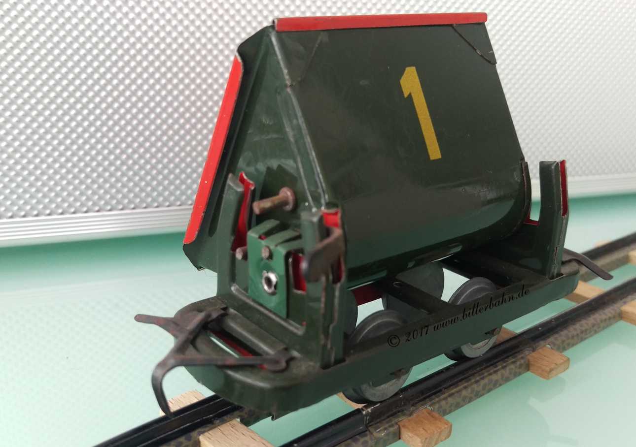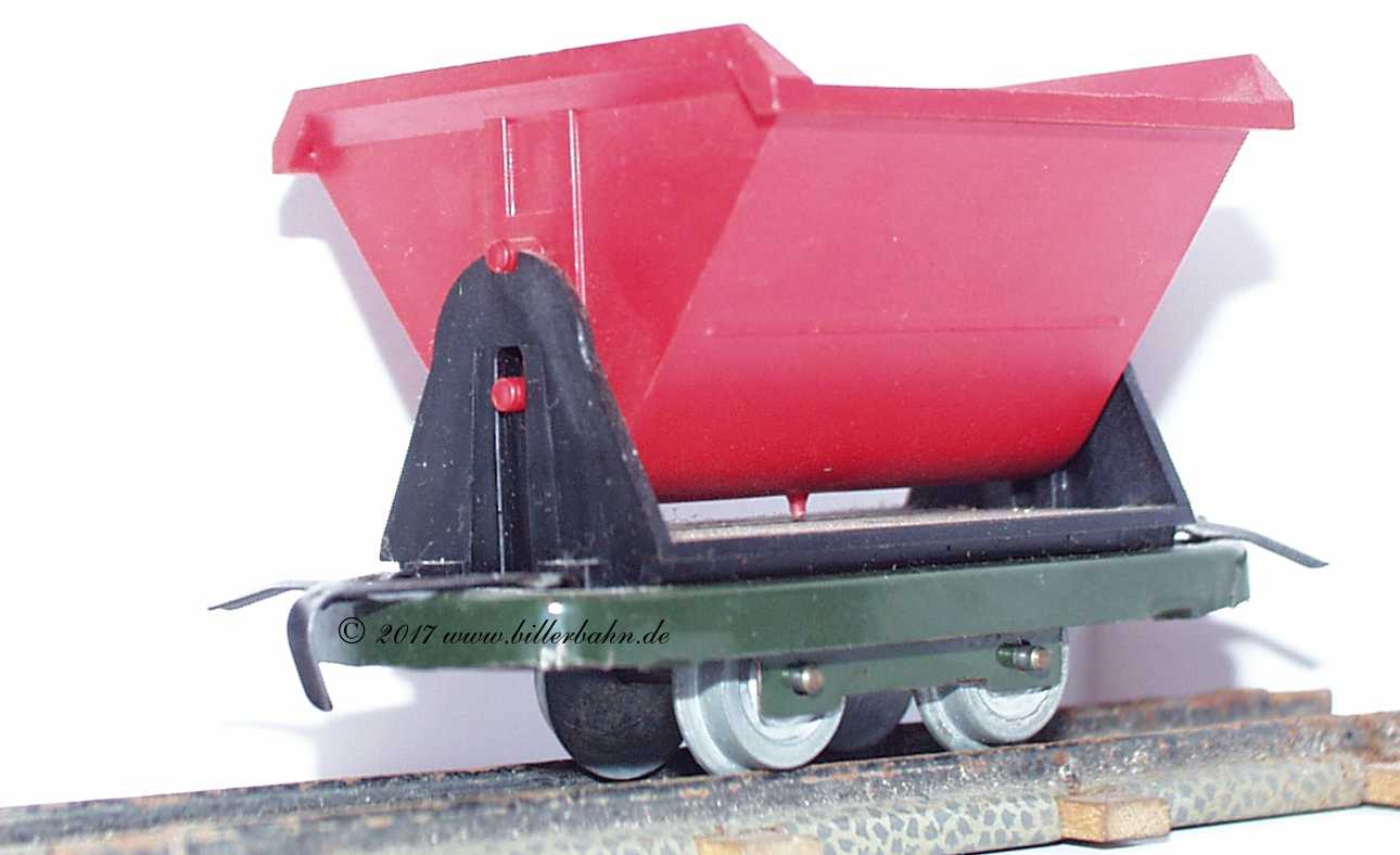 Tipper, numbered from 1 through 9, chassis and tipper light Green, the tipper was removable from the chassis. 3 versions known so far: 1. tipper inside initially Rubin Red (RAL 3003), the holding pins were blackened 2. approx. 1950 and later Fire Red, (RAL 3000), the holding pins were blackened 3. as described at 2. - now the holding pins are metallic blank The tippers were the first models ever issued - and it should last until 1953 before other wagons were emitted. |