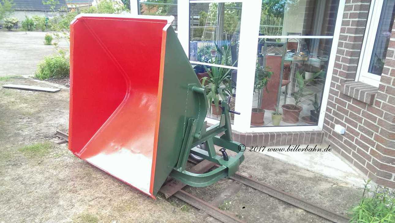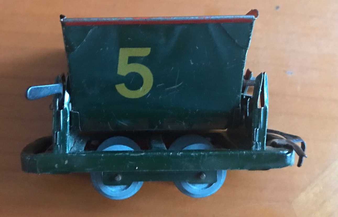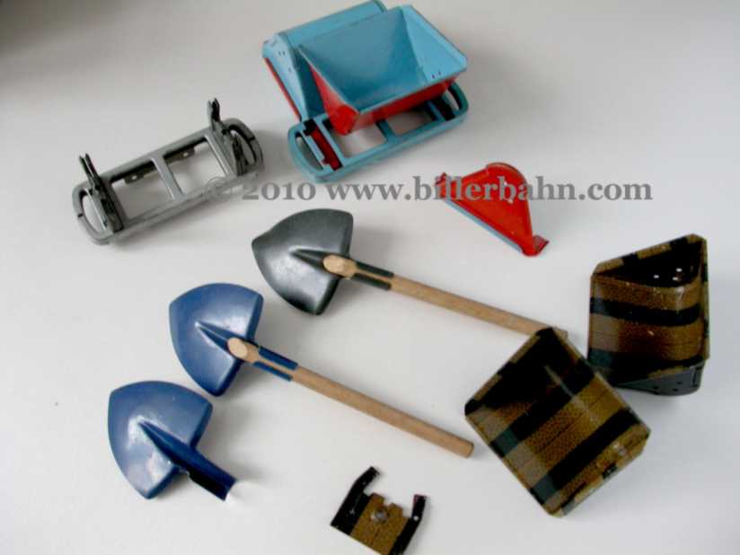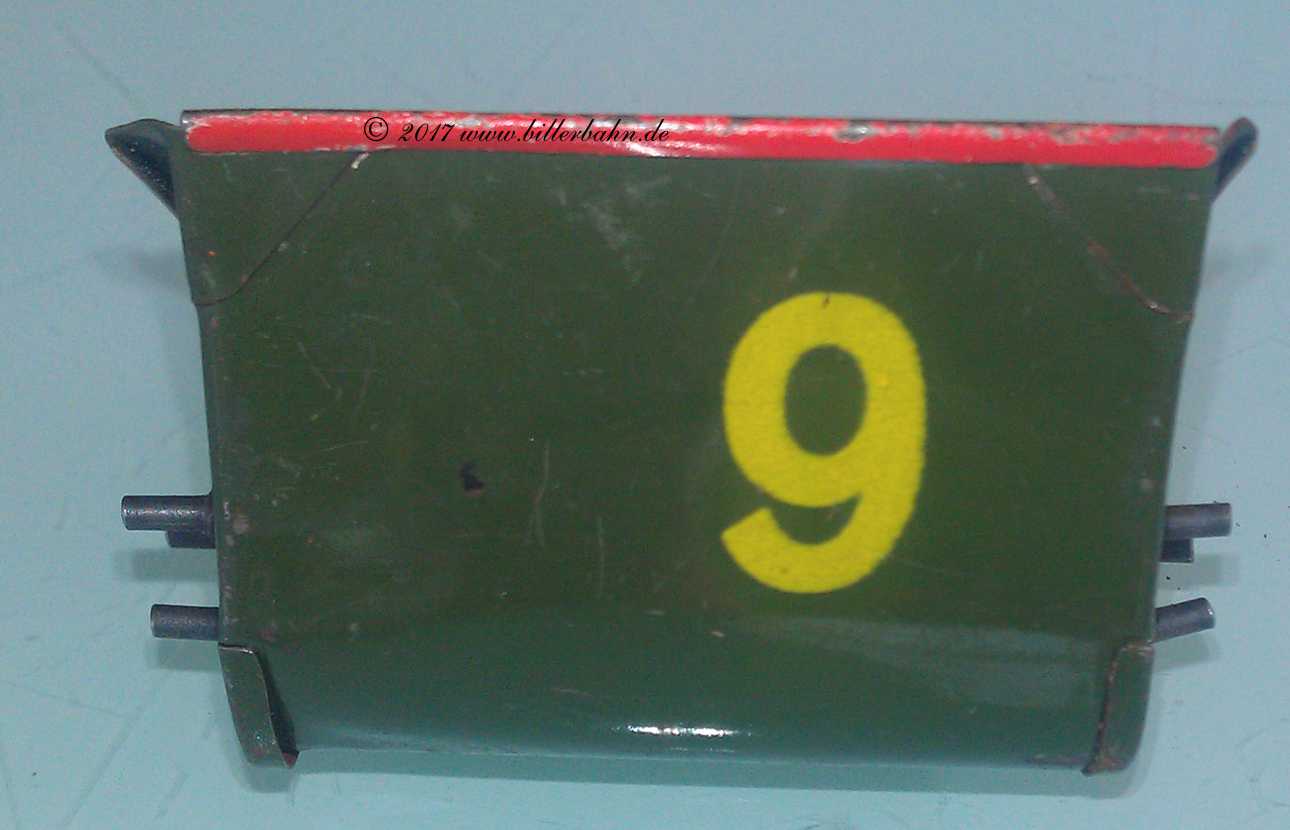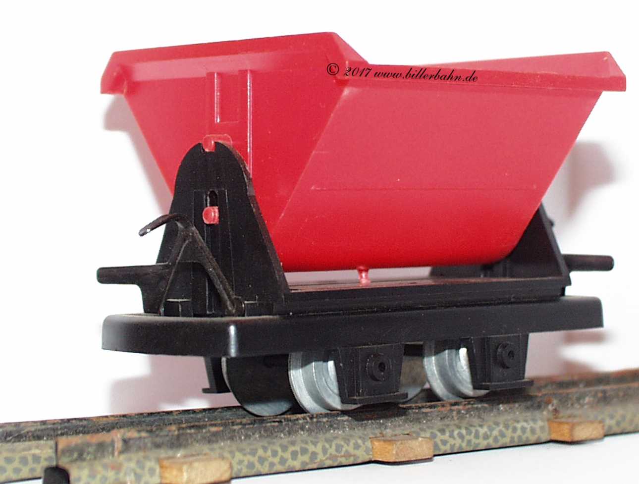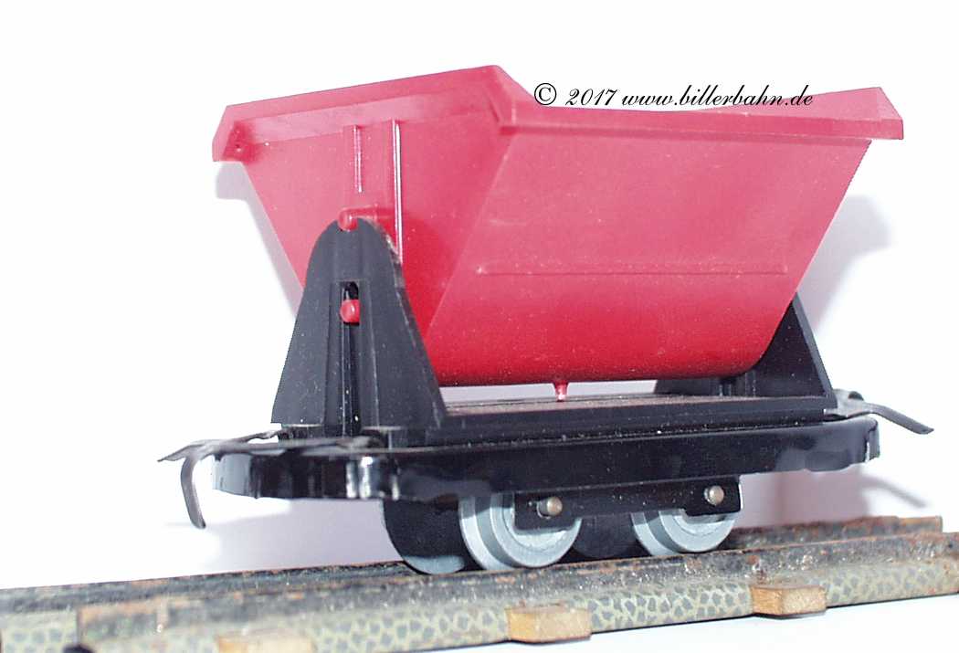 Tipper, numbered from 1 through 9, chassis and tipper light Green, the tipper was removable from the chassis. 3 versions known so far: 1. tipper inside initially Rubin Red (RAL 3003), the holding pins were blackened 2. approx. 1950 and later Fire Red, (RAL 3000), the holding pins were blackened 3. as described at 2. - now the holding pins are metallic blank The tippers were the first models ever issued - and it should last until 1953 before other wagons were emitted. |
