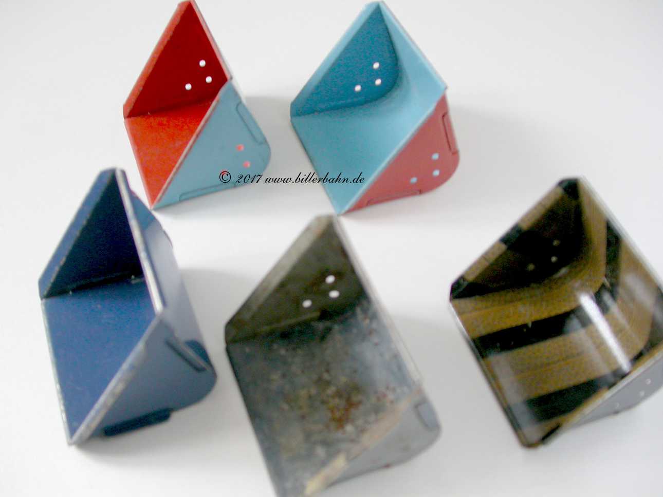 | beginning 1964 the tipper was kept to the chassis by a small additional tin plate - holding pins metallic blank (nickel coated?) - tipper inside Fire Red (RAL 3000). Metal tippers were available until 1971 |