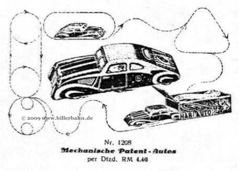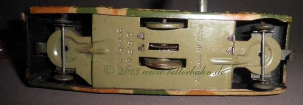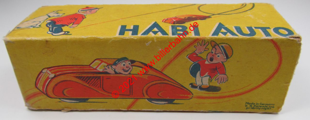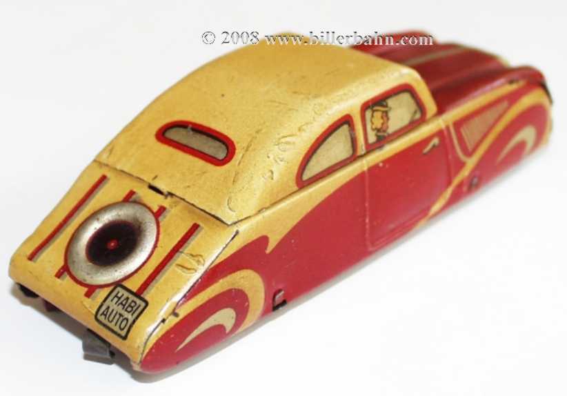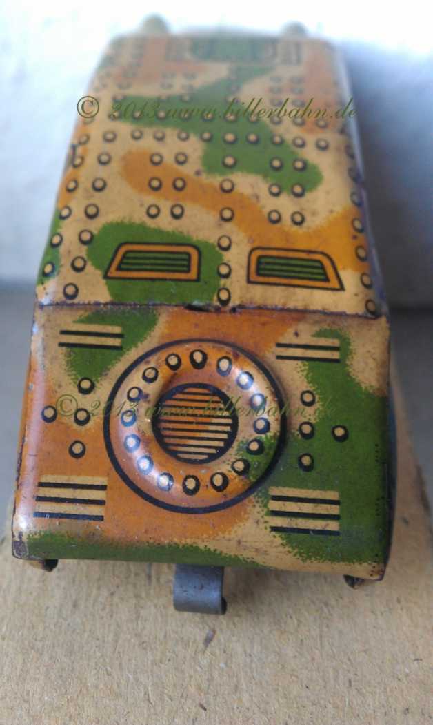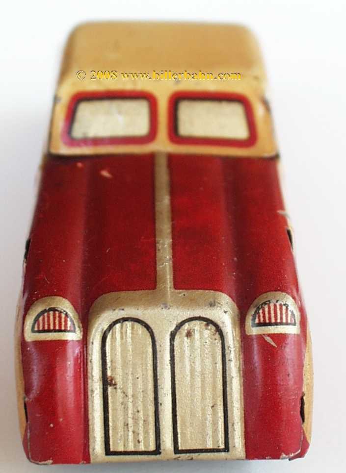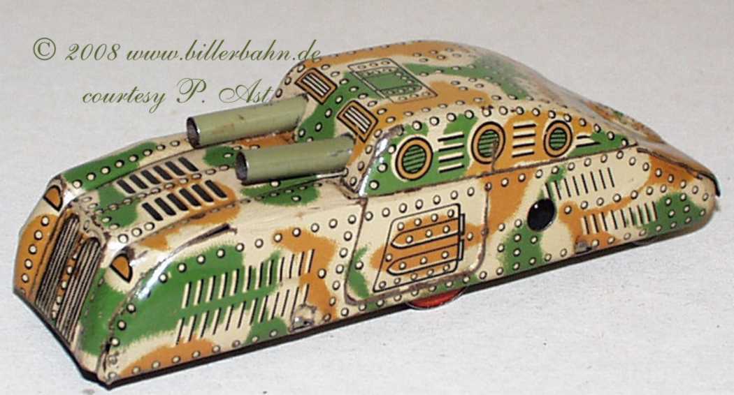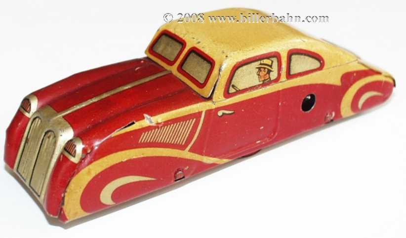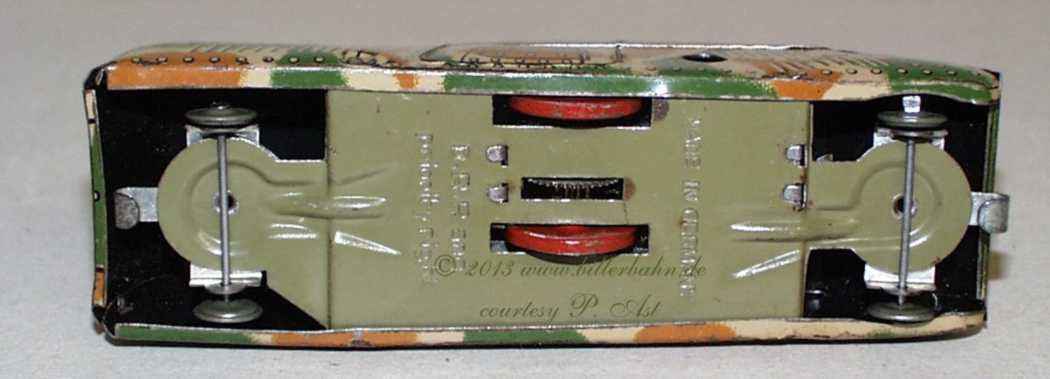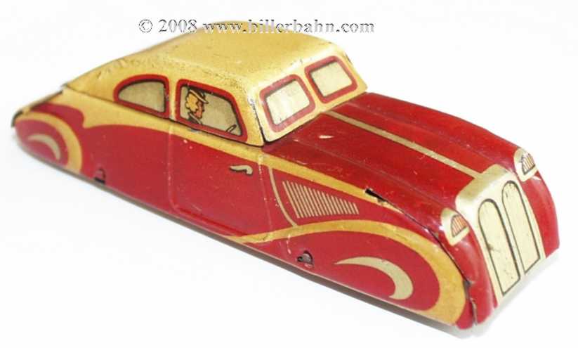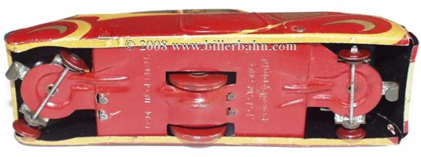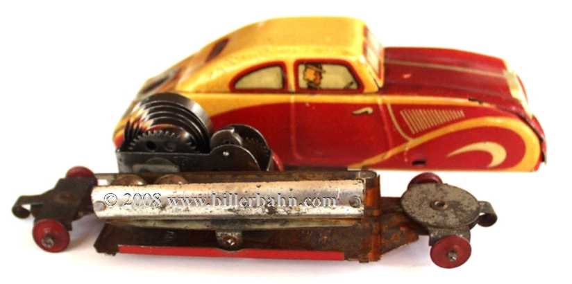 clockwork (by GGN - Georg Grötsch - Nuremberg), 6 wheels in total, the front axle can to be turned to the left only - the rear axle could be turned in either direction. The clockwork drives the inner wheel of the middle axle as well as a seesaw carrying two steel balls - these shifting the balance of the car and thus making the car prescribe different figures. Endurance is a little bid more than 20 seconds. Available as of 1937 - possibly earlier |
