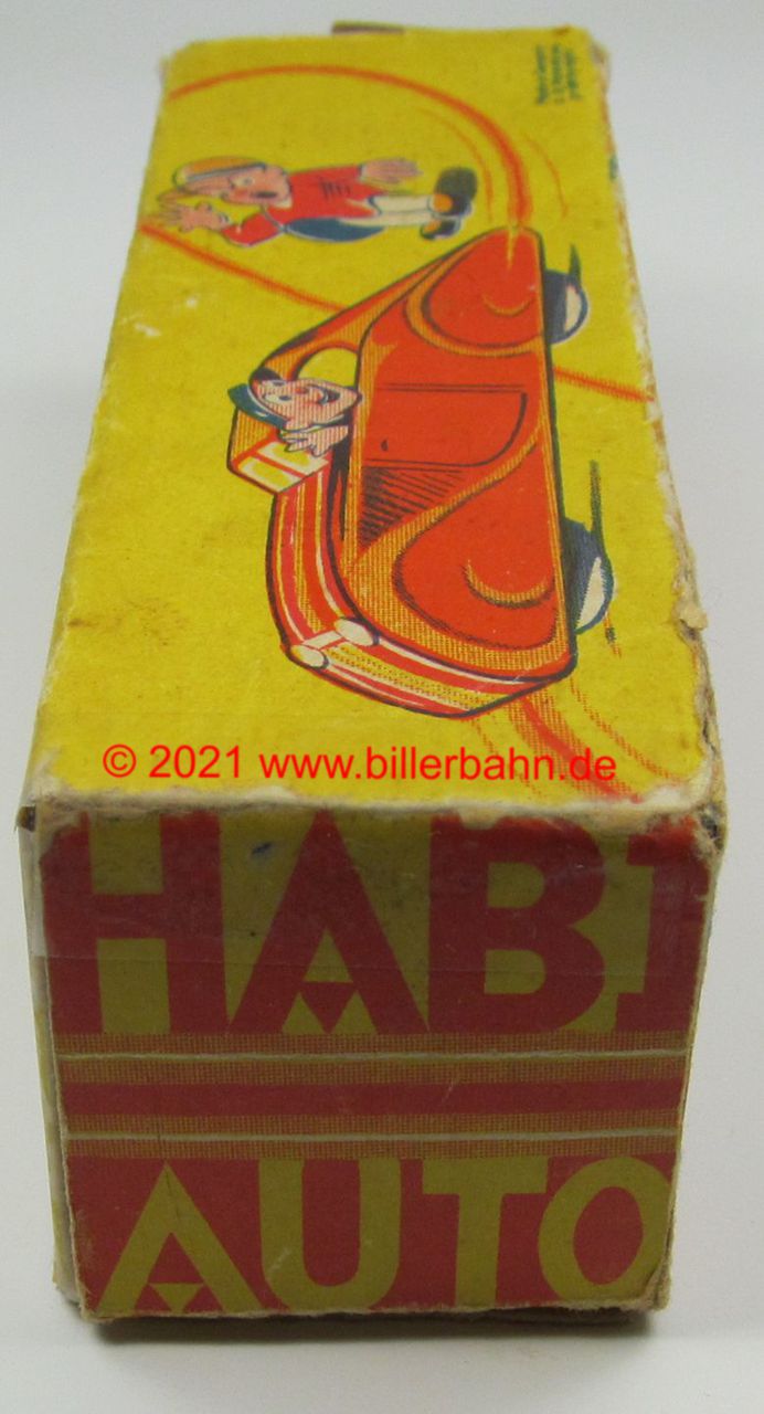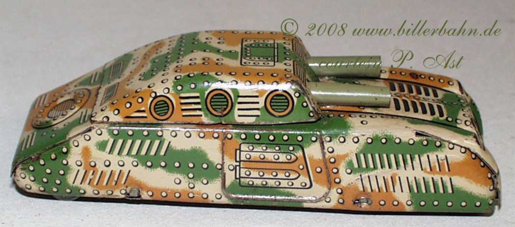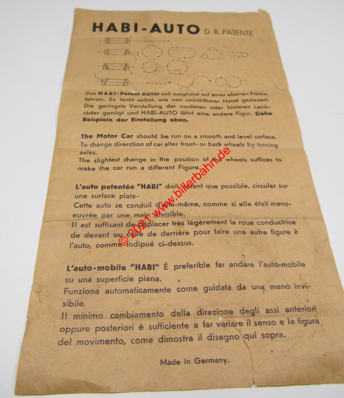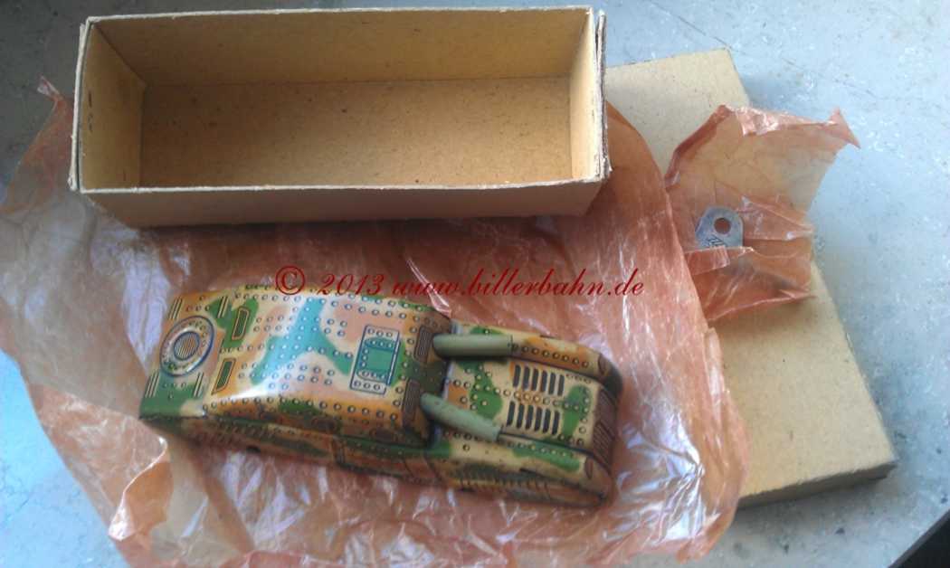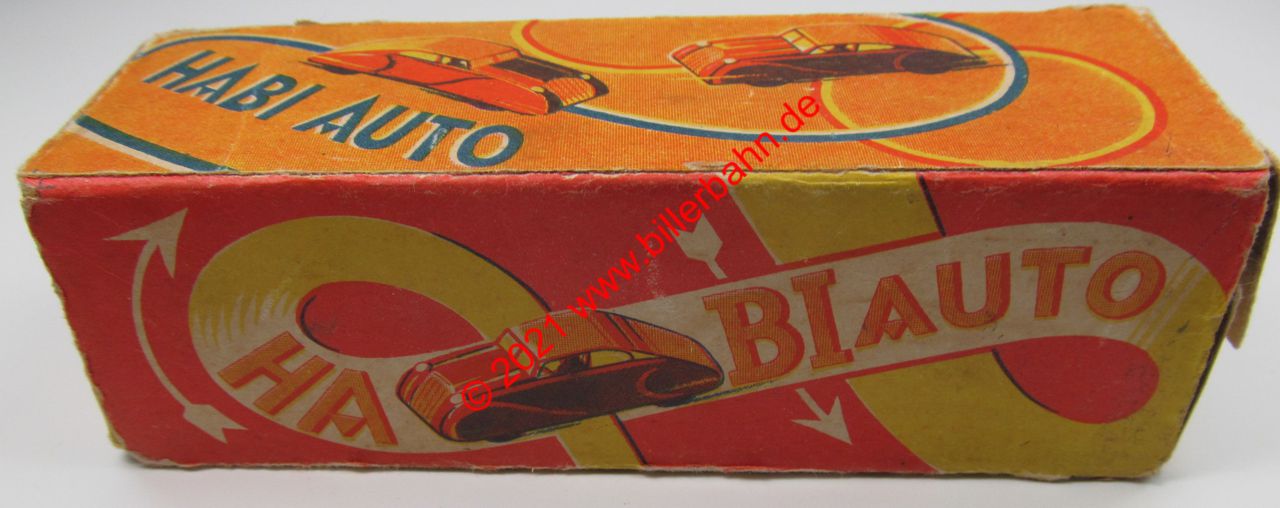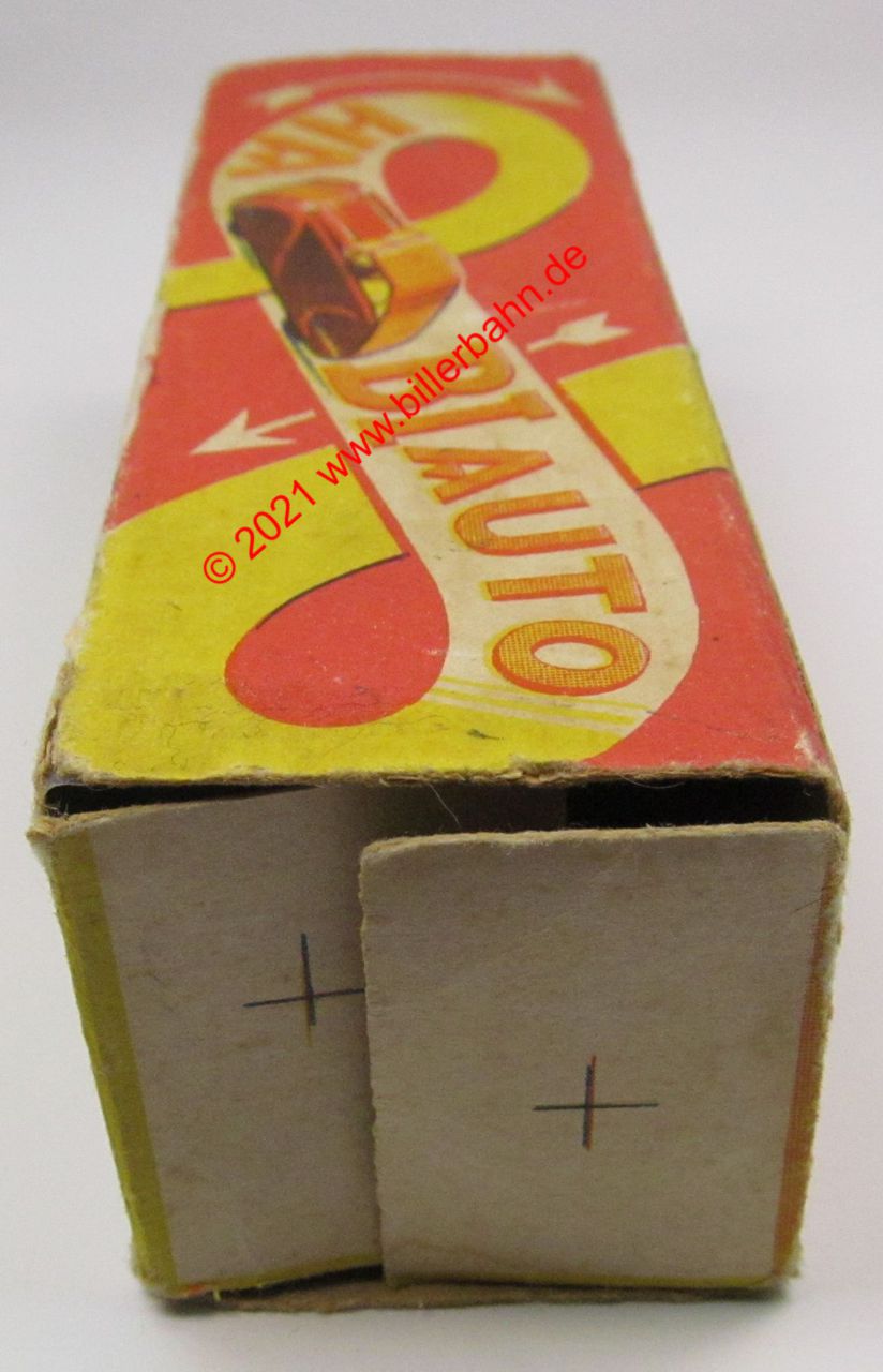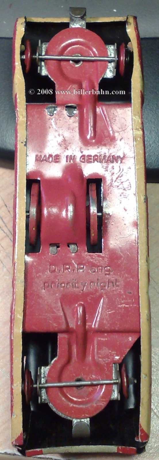 clockwork (by GGN - Georg Grötsch - Nuremberg), 6 wheels in total, the front axle can to be turned to the left only - the rear axle could be turned in either direction. The clockwork drives the inner wheel of the middle axle as well as a seesaw carrying two steel balls - these shifting the balance of the car and thus making the car prescribe different figures. Endurance is a little bid more than 20 seconds. Available as of 1937 - possibly earlier |