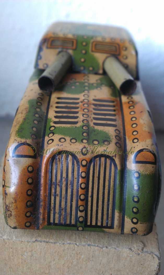 Obviously for propaganda purposes a AA-gun version was issued as well. This car has a twin AA-gun coming out of the front. The gun had NO function e.g. flintstone firing. Both tubes were open and NOT adjustable as to height or direction. "Steering wheels" at the front and the rear were either black or green. The drive axle is known to have either red or green wheels. Issue date for this version is not known - 1939 and later is to be assumed. |