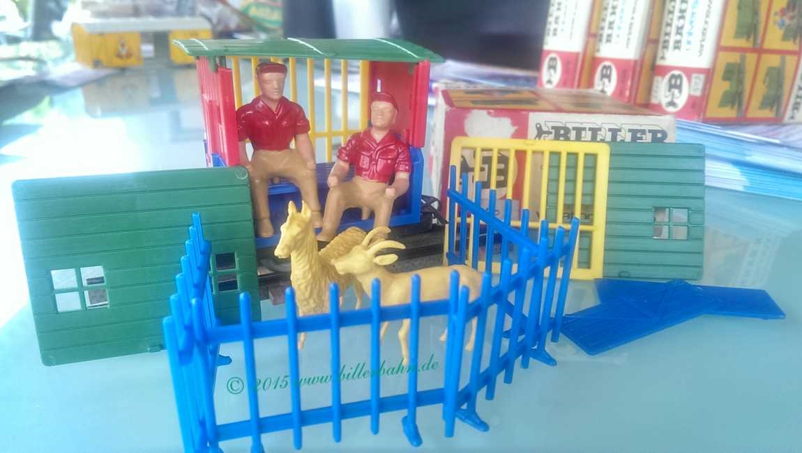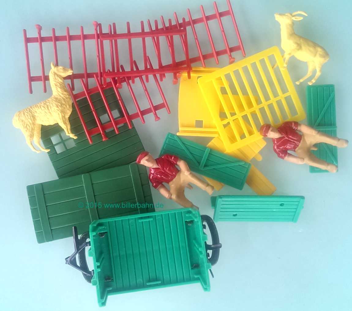 | "Variationswagen", now 15 pieces superstructure as announced in the ctalogues as of 1970, e.g. animals, 4 high side walls, fences, 2 crew and 4 fences. Regardless the way of counting - I never matched the 15 pieces as described. It is always more - up to 19 pieces!!! Deviating from the pictures on the box - NO barrels were delivered!!! | |||||||||||||||||||||||||||||||||||||||||||||||||||