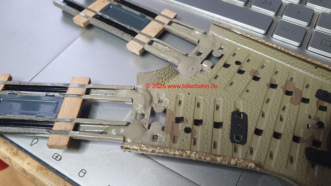 information about Mr. Schilsky — it was before my "Biller days." In addition, I received a total of four converted turnouts at the beginning of 2025. The "heart" is a Märklin turnout, and the incoming and outgoing tracks are half Biller tracks. |
