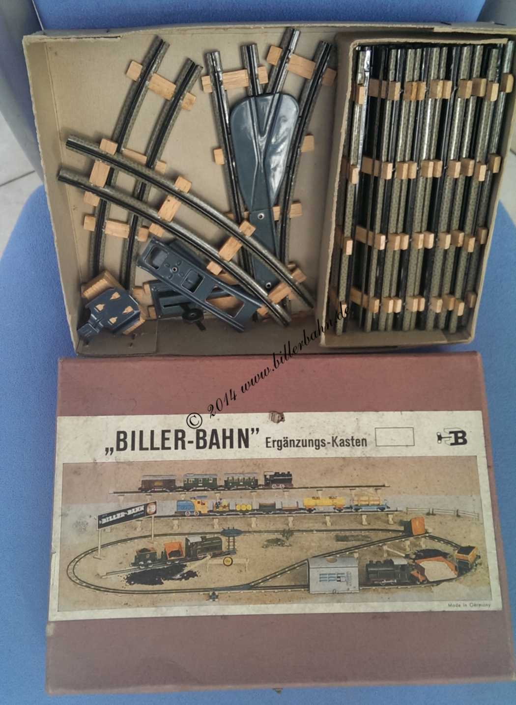 Während nahezu des gesamten Produktionszeitraumes hat Biller auch einige Ergänzungssets zur Billerbahn angeboten. Hier nun das Set E 1 mit verschiedenen Inhalten - anfangs in den grün melierten Pappkartons.... Die Bilder zeigen lediglich eine beispielhafte Zusammenstellung. |